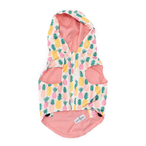 Flip it and reverse it. A classic raincoat to take on the rain. This pineapple reversible rain jacket for your dog is lightweight and ready to brave the elements. We had the on-the-go dog in mind when we designed these: watertight zip closures and a leash clasp opening on the backside of the coat to get out the door and dance in the rain.