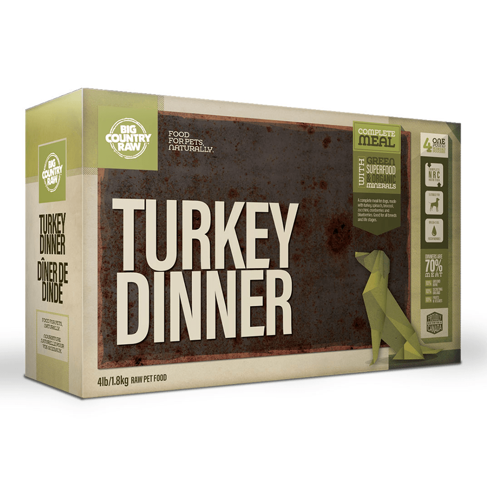 A Big Country Raw favourite with meaty Ontario raised turkey, that’s a rich source of pure meat protein and perfect for dogs with sensitivity to chicken! Turkey is high in protein, making it an excellent choice for working and active breeds. With added organic fruits and vegetables that are packed with natural antioxidants and essential nutrients, this meal will soon be your dog’s daily request!