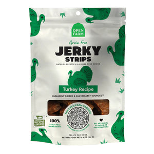 Open Farm turkey jerky strips feature humanely raised turkey to deliver an incredible taste your dog will crave! As with all Open Farm products, our ethically sourced, farm to bowl ingredients are 100% traceable. Our jerky strips are crafted in a way that respects animal welfare and our planet. Approximately 7-8 strips per bag.