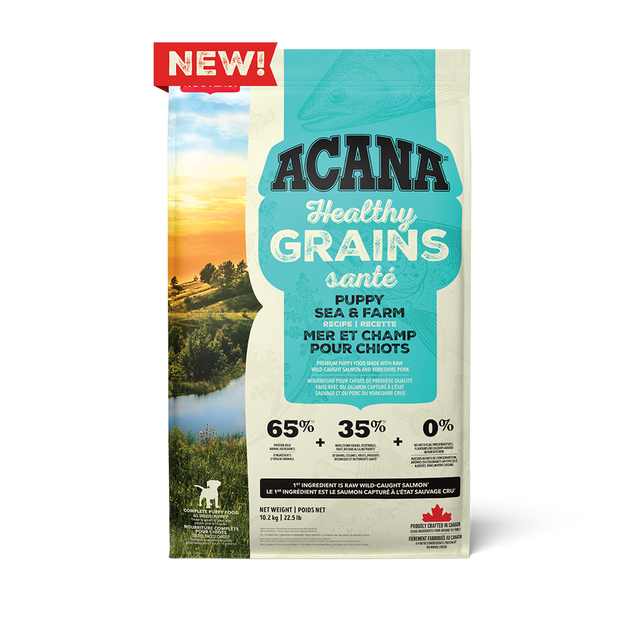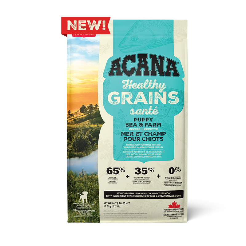 Get obsessed with protein-rich animal ingredients and fibre-rich wholesome grains in ACANA™ Healthy Grains™! Our ACANA Healthy Grains Puppy Sea & Farm Recipe is a poultry-free recipe specially crafted to support your puppy’s development with raw wild-caught salmon and Yorkshire pork. It’s also balanced with healthy grains in the form of oats, sorghum and millet. These grains are high in fibre and gluten-free, offering added nutrition that helps support a healthy digestive environment. Our Puppy Sea & Farm Recipe is crafted with 65% protein-rich animal ingredients* balanced with 35% wholesome grains, vegetables, fruit, botanicals and nutrients**. Plus, it helps support key health benefits for your puppy including Brain Development and Muscle and Bone Development. Help support your puppy’s growth and development with a nutritious and delicious protein-rich food.