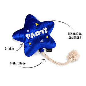 - Features crinkle, t-shirt rope, and tenacious squeaker