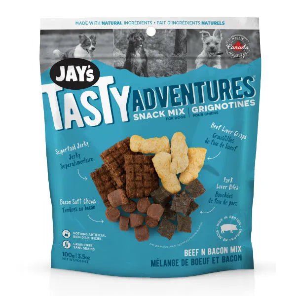 Jay's Tasty Adventure Snack Mix Dog Treats is a variety treat pack mixed with wholesome, healthy treats. The Beef N Bacon mix has the soft superfood jerky, soft chews, pork liver bits and the irresistible crunchy beef liver crips. Each made using beef, pork and mixed with a variety of unique ingredients such as chia seeds, dulce, and yellow peas that help and support the overall health of your best friend. Easy to break apart makes this a perfect treat for training or spoiling.