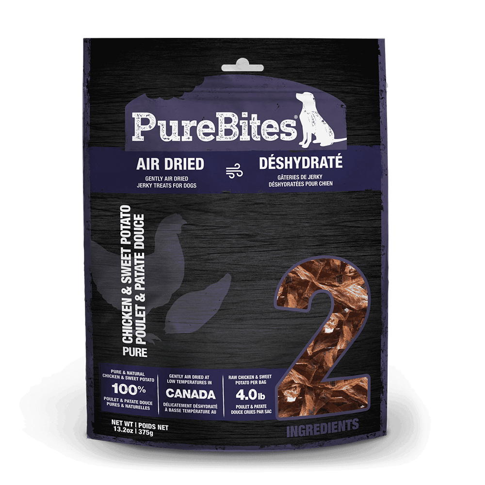 Go ahead, turn the bag around and look at our ingredients. PureBites Chicken & Sweet Potato air dried dog treats are made with only 2 ingredients; 100% Pure & Natural Chicken Breast & Sweet Potato. Dogs love the taste of PureBites because our treats are gently air dried to lock in the aroma, texture and freshness they crave. Dog parents love PureBites because our treats are 100% pure and rich in nutrients for a happy & healthy life.