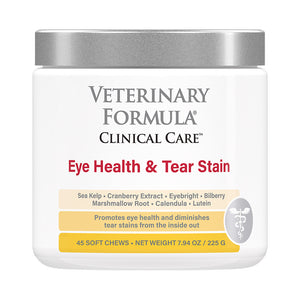 Veterinary Formula Tear Stain Supplement for Dogs is a clinically proven antimicrobial formula made with ingredients like kelp, cranberry extract, vitamin C, eyebright, calendula and marshmallow root. This formula uses all natural ingredients like cranberry extract to help reduce the formation of tear stains and marshmallow root, a herb, that provides natural fiber and antioxidants to support tear duct lubrication. This powerful combination of ingredients all work together to give your dog beautiful, healthy eyes and a strong immune system. Available in 30 soft chews and made in the USA.