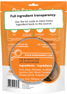Ingredients: Humanely Raised Pork, Garbanzo Beans (Chickpeas), Molasses, Sunflower Lecithin, Sea Salt, Mixed Tocopherols (a natural preservative), Rosemary Extract