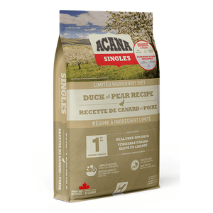 Our Best Recipe Ever! ACANA Singles Duck with Pear Recipe is now loaded with more meat, less legumes, and no peas for enhanced nutrition and taste your dog will love! Our Limited Ingredient recipe includes 60% quality duck ingredients in WholePrey ratios of duck, organs, and cartilage, complemented with fresh pears, providing your dog with the protein and nutrients they need in order to stay happy, healthy, and strong.