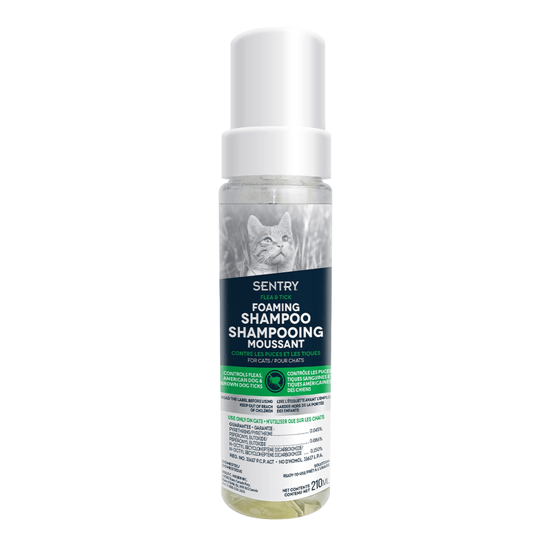 Provide your cat with relief from fleas and ticks by bathing him/her in Sentry Flea and Tick Foaming Shampoo for Cats. This medicated foaming shampoo is gentle on the skin and coat, and acts quickly and decisively to eliminate the problem and keep your cat flea and tick free. Do not use on sick animals.