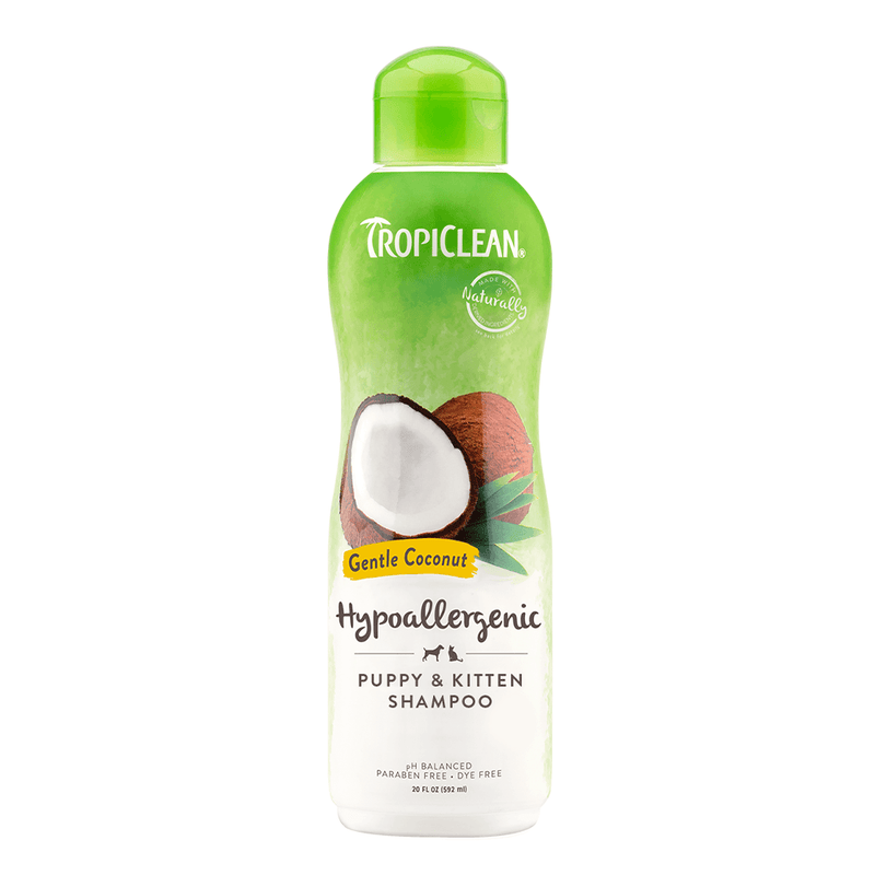 TropiClean Hypoallergenic Puppy & Kitten Shampoo is mild enough for puppies, kittens and pets with allergies. Our mild coconut cleanser gently cleanses your pet’s coat while aloe replenishes skin’s moisture for a fresh, healthy clean. Bath time is gentle and easy with our simple, naturally derived ingredients that keep your pet clean, tear free, and oh-so snuggly. For dogs and cats 12 weeks or older.