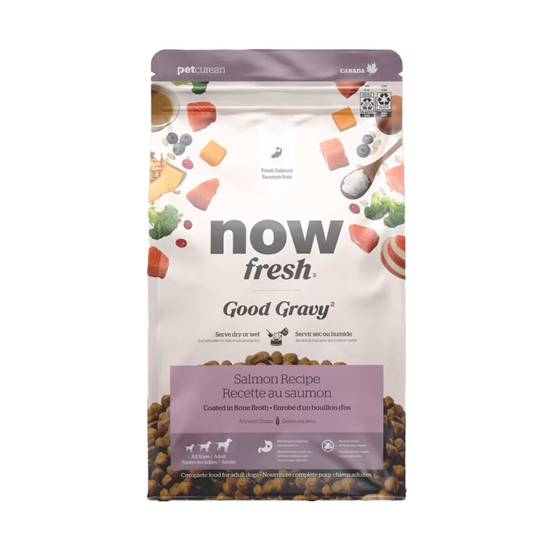 Get your dog doing the 'happy dance' with Good Gravy Salmon dog food, enriched with ancient grains and a bone broth coating. Easily feed dry or mix with water to create a delicious, hydrating gravy for dogs. Crafted for complete nutrition and yummy flavour, this recipe features fresh salmon for easily digested protein and omega-3s for skin and coat support, plus nutrient-rich fruits and veggies.