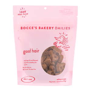 We are not the only ones in need of some daily TLC. Let's keep your pup feeling not a day over one, and extra fresh for those sloppy 'welcome home' smooches. Good Hair Dailies are rich in omega-3s and flaxseed to promote healthy skin and coat with a tasty salmon flavor in every bite.