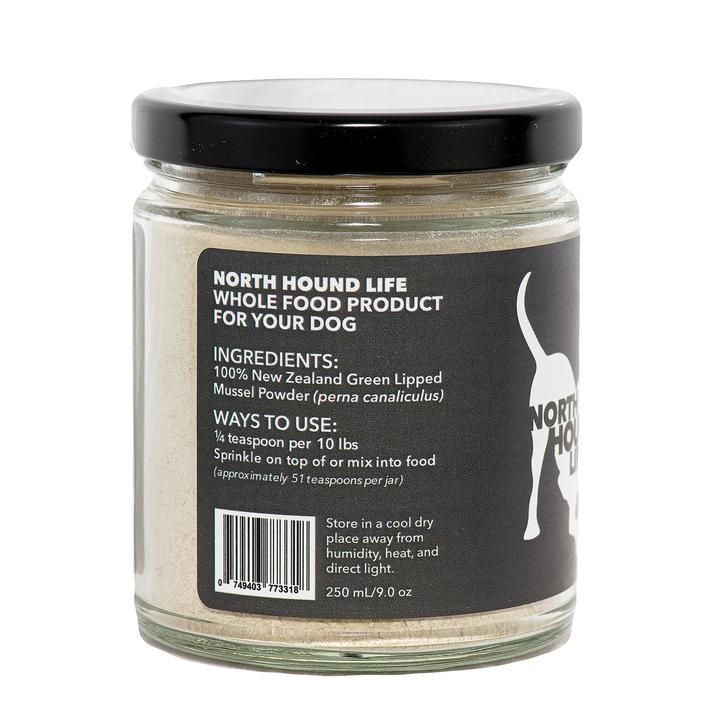 A whole food product for your dog.  Made with 100% New Zealand Green Lipped Mussel Powder - a bioactive, multi-beneficial food to make your dog's joints happy. This superfood is a recognized source of naturally occurring chondroitin sulphate, glucosamine, Omega 3, selenium, zinc, copper, and manganese is also rich in calcium, potassium, enzymes such as betaine, polypeptides, and complex proteins. Added to your dog's diet regularly it has been known to improve mobility and reduce pain from inflammation of the joint due to arthritis.