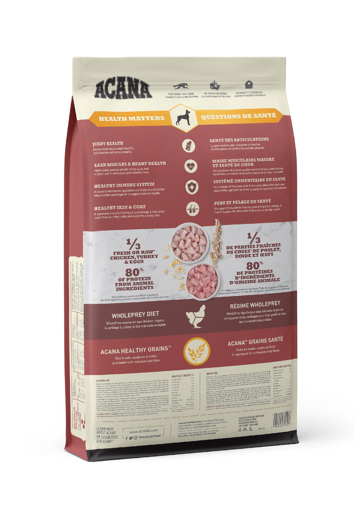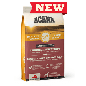 Our ACANA® food for dogs always goes beyond the 1st ingredient™, with thoughtfully crafted recipes from start to finish. That’s why ACANA Healthy Grains Large Breed Recipe is crafted with fresh or raw free-run chicken, turkey & cage-free eggs. It’s also balanced with healthy grains in the form of oats, sorghum and millet. These grains are high in fiber and gluten-free, offering added nutrition that helps support a healthy digestive environment. Our Healthy Grains Large Breed recipe also includes essential vitamins and minerals that keep your large breed dog healthy and strong.