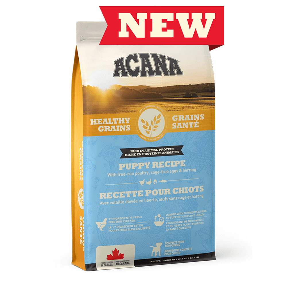 Our ACANA® food for dogs is always thoughtfully crafted recipes from start to finish. That’s why our ACANA Healthy Grains Puppy Recipe is specially crafted to support growing puppies with fresh or raw free-run poultry, cage-free eggs and herring. It’s also balanced with healthy grains in the form of oats, sorghum and millet. These grains are high in fiber and gluten-free, offering added nutrition that helps support a healthy digestive environment. Our Healthy Grains Puppy Recipe also includes essential vitamins and minerals that nurture your puppy’s development.