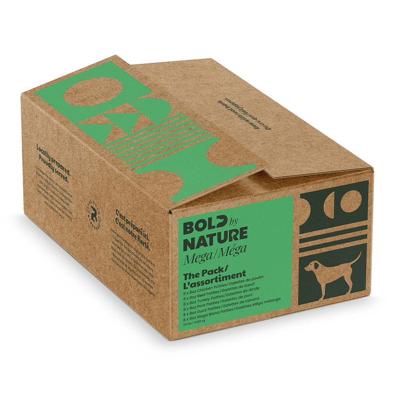Mega flavour. Mega Variety. This Pack comes with all of our Bold by Nature Mega flavour favourites: Mega Chicken, Mega Beef, Mega Turkey, Mega Pork, Mega Duck and Mega Blend patties. Locally prepared with pet approved ingredients. This is for the dogs that want it all.