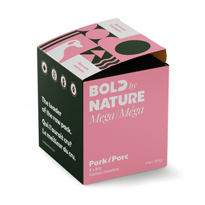 Complete protein. Complete flavour. Our Bold By Nature Mega Pork patties are full of ground pork meat, ground bone, organ meats and fresh veggies. Bring home the bacon and nutrition.