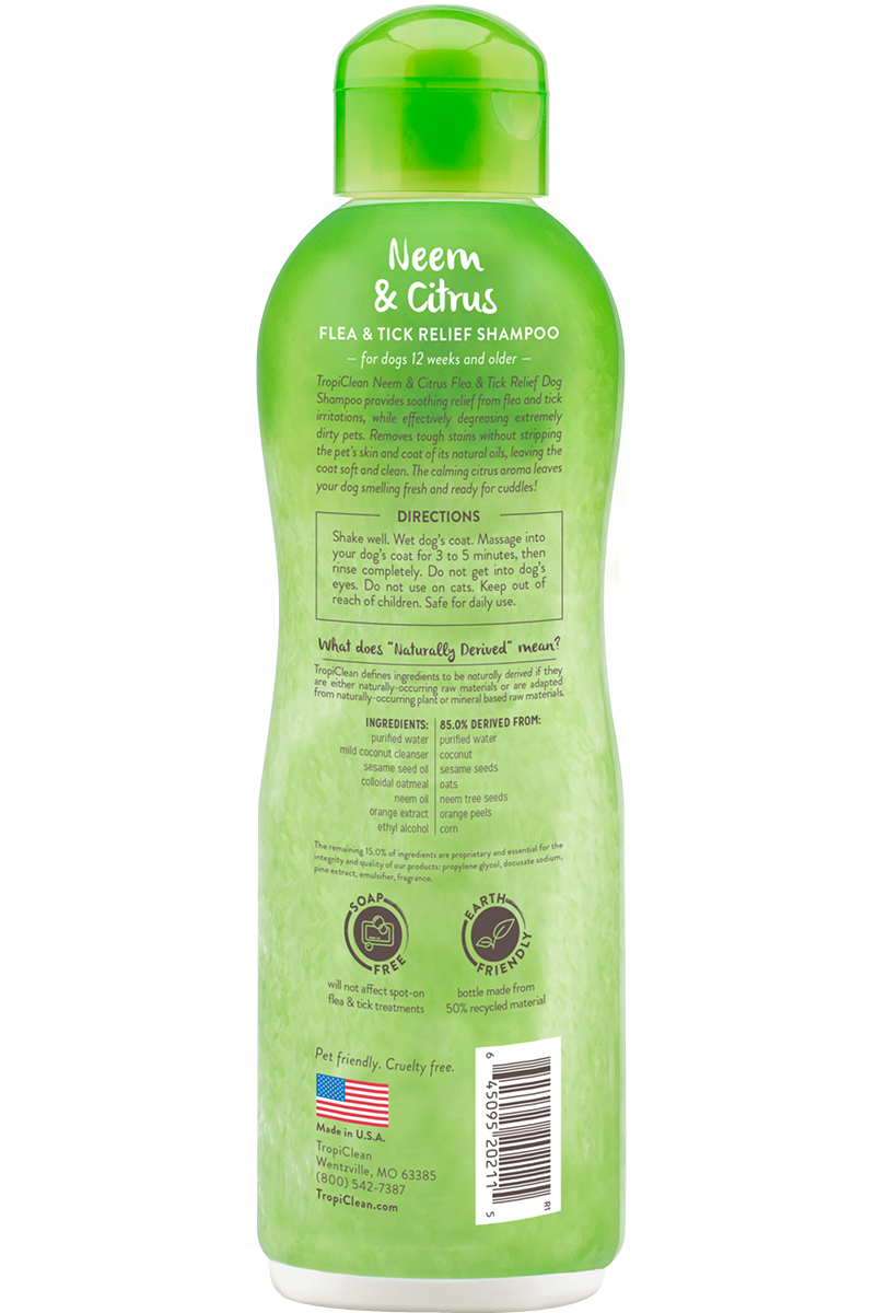 TropiClean Neem & Citrus Pet Shampoo provides effective, soothing relief to flea and tick irritations, while reducing pet odor. This effective Neem (also known as Indian Lilac) shampoo is deep-cleaning with a great lather to clean the dirtiest pets while resulting in a healthy, shiny coat. Can also be used as a de-greasing shampoo. Please note, this shampoo is designed for use on dogs only.