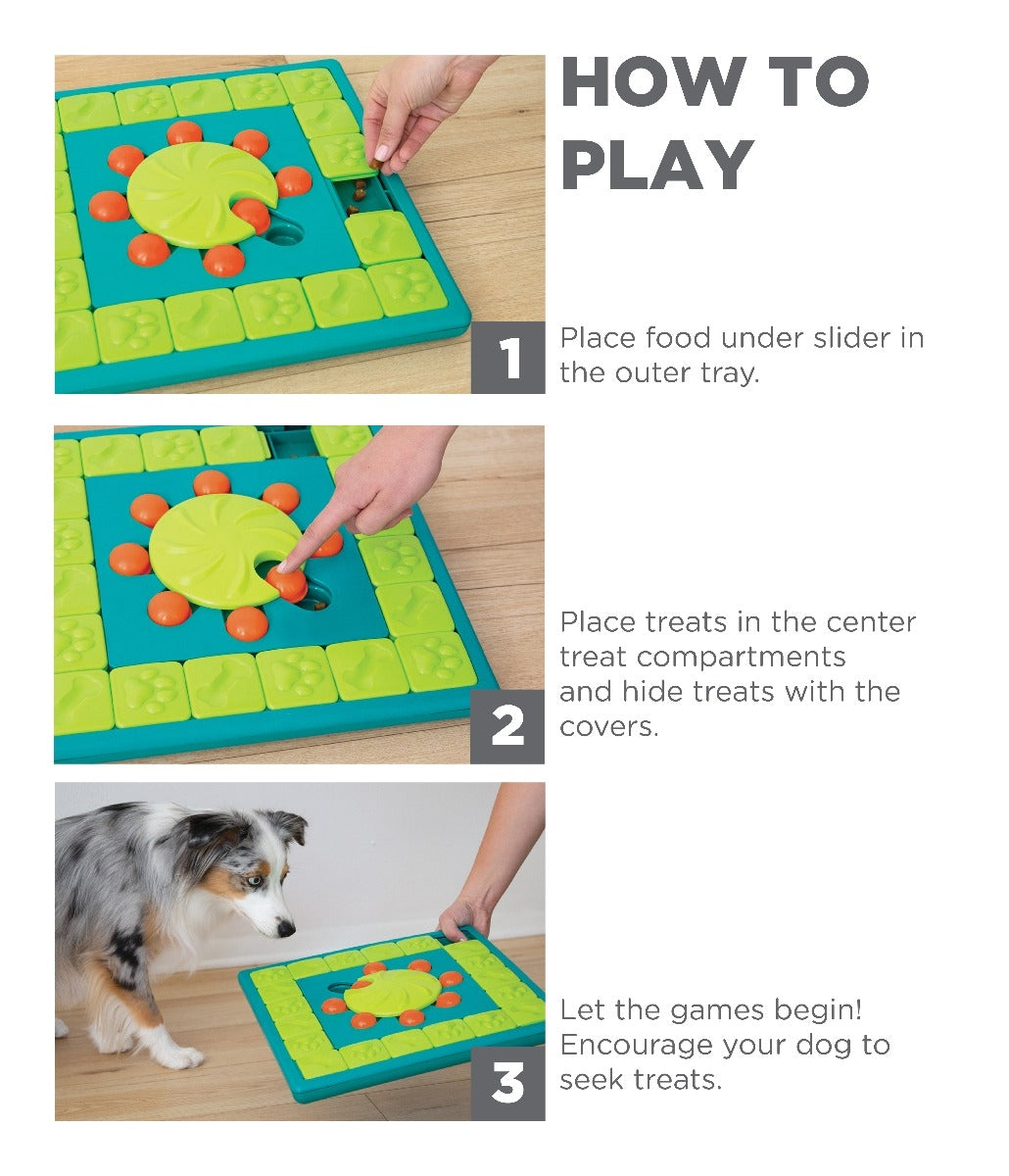 • SLIDE, HIDE, AND SEEK: Place your dog's favorite treats under the sliders in the outer tray and in the center treat compartments. Slide the covers in the center over the treat compartments to hide the treats. Encourage your dog to seek the treats and let the games begin!