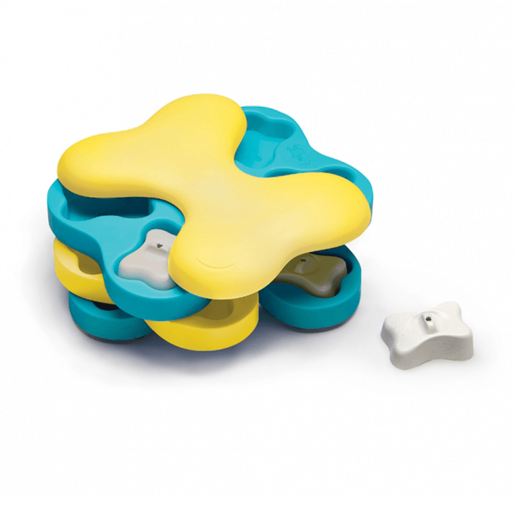 The Dog Tornado level 2 interactive dog puzzle from Nina Ottosson is the ideal toy for bored dogs and will keep them occupied for hours! This intermediate level toy features three tiers with twelve compartments for dog snacks or kibble. This mentally stimulating and entertaining dog game encourages your pup to spin the interactive puzzle tiers to reveal the rewards – three bone shaped covers can be used to increase the difficulty! Made of BPA, PVC & phthalate-free material that can be hand washed between each use with warm water and soap.