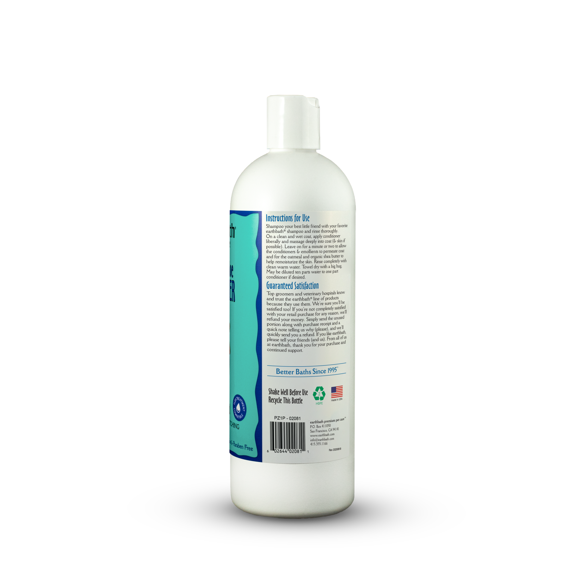 Shake well before using. On a wet coat, lather your pet thoroughly with a few good palm-fulls of earthbath® pet shampoo. Remember to eliminate all escape routes well in advance (a tip: once your pet is slippery wet, he or she is suddenly smarter and faster than you are). Work lather from head to tail, paying special attention to irritated areas. Keep out of eyes. Leave on for at least 90 seconds to allow oatmeal and organic aloe vera to work their magic. May be diluted ten parts water to one part shampoo if desired.