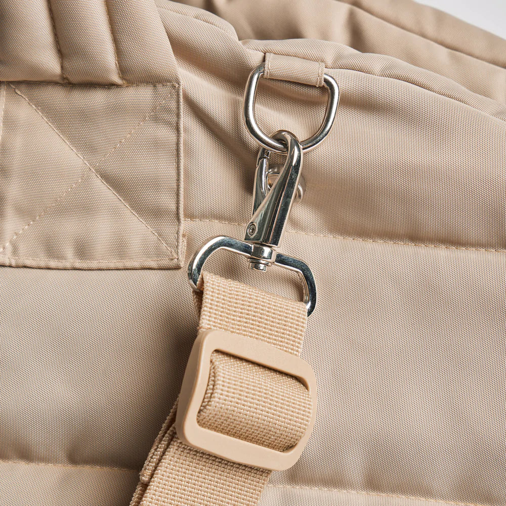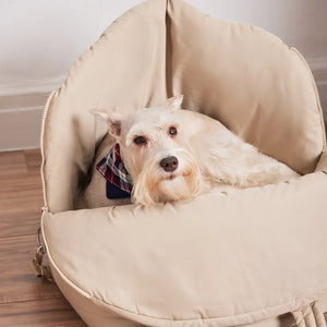 Car seat Lola doubles as a cushy carrier! Featuring soft padding at the front and back to protect your furry babies from sudden stops. Waterproof cream nylon fabric provides a comfy ride and easy cleaning. The separate bottom cushion can be removed and used as a cushion at home. Additionally, the cushion is dual-sided—a soft fleece side for extra warmth and a waterproof side for dirty paws. The two handles make it easy to carry from the house to your car. There are 2 secure belts that attach to the top and bottom of your car seat for extra security. Just lift, buckle and go!