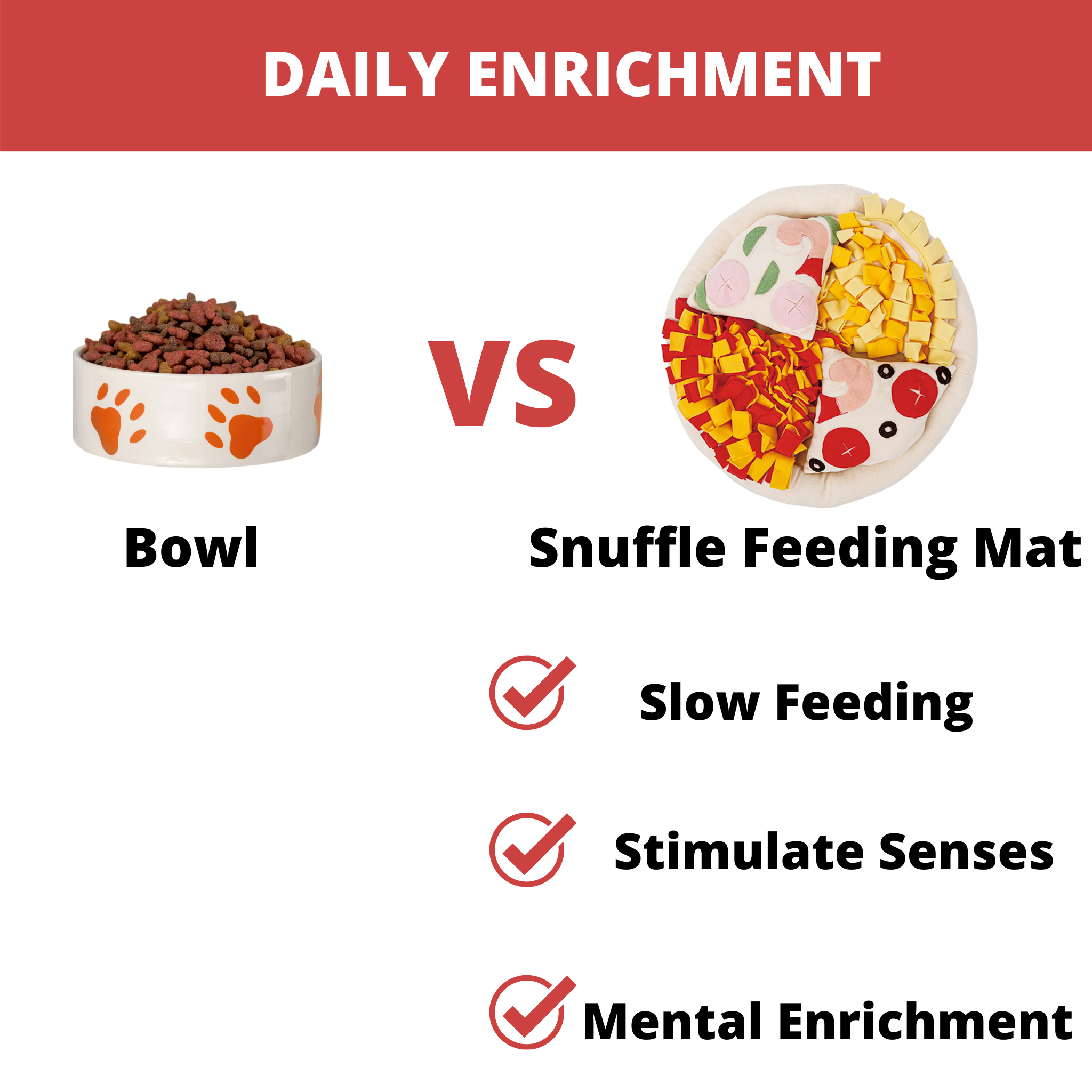Show your pup how what it's like to eat in the wild with Injoya's "Pizza" Snuffle Feeding Mat. Our feeding mat activates foraging instincts by mimicking the hunt. Made of non-toxic and durable materials, stimulates your dog's senses, and makes meals fun. No-slip backing and machine washable. Perfect for all breeds.