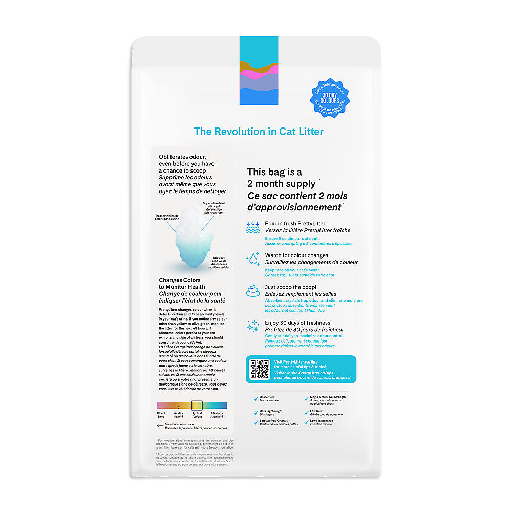 PrettyLitter is the world's smartest cat litter. Absorbent non-clumping crystals trap odour instantly and eliminate moisture, making it ideal for single and multiple-cat households. This revolutionary, lightweight litter changes colour to help you monitor your cat's health. It can help detect issues such as urinary tract infections (UTIs), bladder inflammation, urinary stones, and blood in the urine. One 8lb. bag of PrettyLitter lasts about 2 months and saves you the trouble of transporting heavy cat litter. Low-dust, super absorbent crystals eliminate liquid so you only need to scoop the poop, which translates to easy maintenance and less litter wasted. The long-lasting, non-clumping litter means lighter trash bags, less scooping and fewer trips to the store. This lightweight, health-monitoring litter is here to take some of the stress out of cat parenting, so you can focus on what matters most - living a long and happy life together.