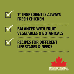 Ingredients: Fresh chicken (18%), chicken meal (18%), whole red lentils, whole green peas, fresh chicken giblets (liver, heart) (7%), chicken fat (7%), turkey meal (4%), eggs (4%), raw flounder (4%), herring meal (4%), fish oil (3%), whole green lentils, whole chickpeas, whole yellow peas, pea fiber, pea starch, raw turkey livers (1%), salt, dried kelp, fresh whole pumpkin, fresh whole butternut squash, fresh whole carrots, fresh whole apples, fresh whole pears, fresh whole zucchini, dried chicory root, fresh kale, fresh spinach, fresh turnip greens, fresh beet greens, fresh whole cranberries, fresh whole blueberries, fresh whole saskatoon berries, turmeric, milk thistle, burdock root, lavender, marshmallow root, rosehips