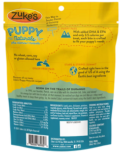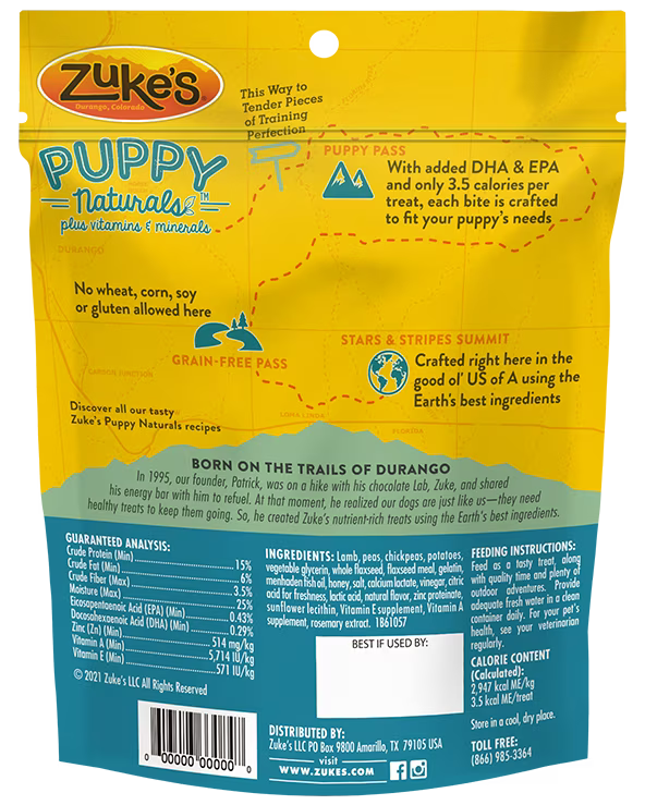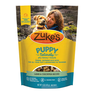 To your puppy, every day is a new adventure. There’s so much to learn: Come. Sit. Stay. And, perhaps most important, always do your business outside. Treat your way to a better-behaved puppy with grain-free Zuke’s Puppy Naturals. They’re an ideal, puppy-sized reward for a job well done and a perfect complement to your pup’s playful spirit and developing taste buds. Specially crafted in the USA using the Earth’s best ingredients, they’re made with protein-rich salmon, pork or lamb, plus added DHA and EPA to help support puppy’s healthy brain development. Mighty impressive at just 3.5 calories per treat.