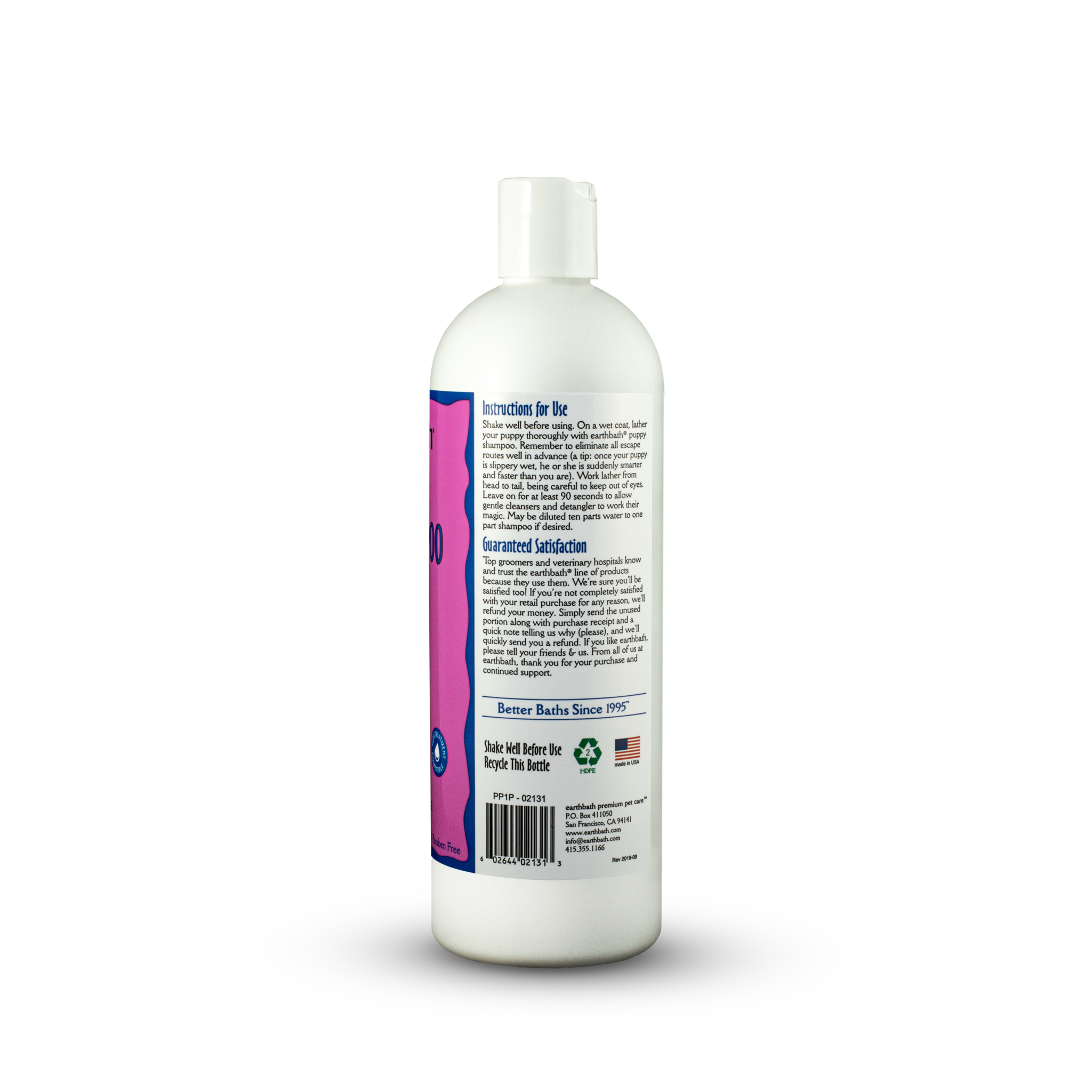 Shake well before using. On a wet coat, lather your puppy thoroughly with earthbath® puppy shampoo. Remember to eliminate all escape routes well in advance (a tip: once your puppy is slippery wet, he or she is suddenly smarter and faster than you are). Work lather from head to tail, being careful to keep out of eyes. Leave on for at least 90 seconds to allow gentle cleansers and detangler to work their magic. May be diluted ten parts water to one part shampoo if desired.