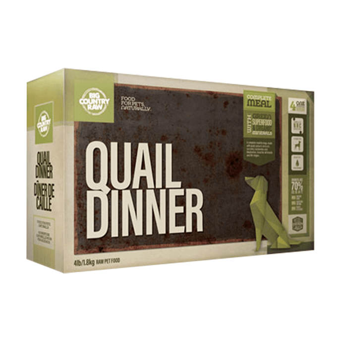 Quail dinner is a complete meal for dogs, made with quail, pork, spinach, broccoli, zucchini, cranberries and blueberries. Good for all breeds and life stages.