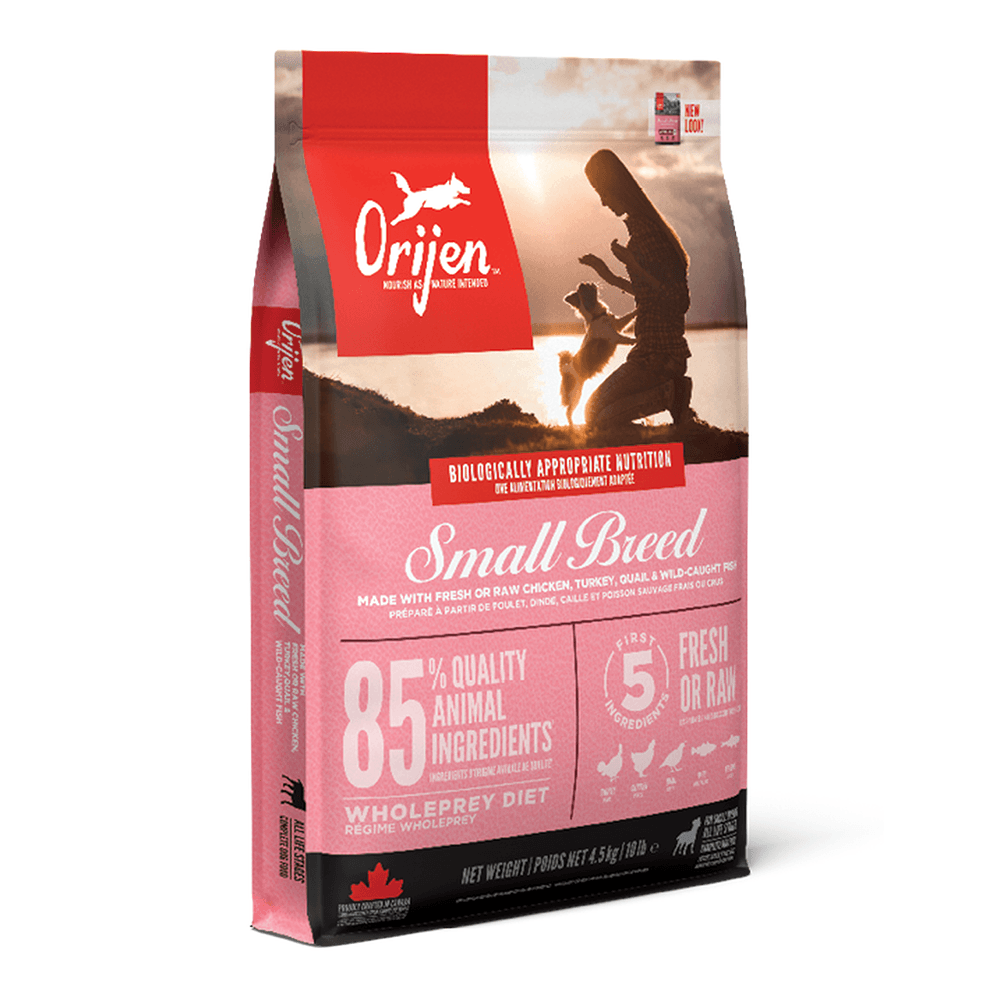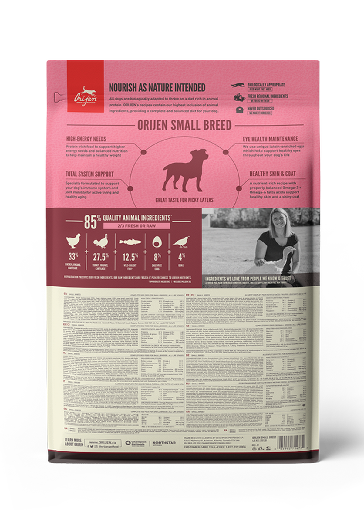 Help your dog thrive with the power of protein-rich recipes that provide peak nourishment. Your small-breed dog has certain nutritional needs and requires a Biologically Appropriate diet in order to thrive. ORIJEN® Small Breed diet is made specifically for smaller dogs, with nourishing protein from free-run1 chicken and turkey, wild-caught fish and quail all packed into a unique kibble shape that is easier for them to eat. Packed with fresh or raw2 WholePrey animal ingredients, ORIJEN food is made with the most nutrient-dense, succulent parts of the prey to deliver the nutrition dogs need. The result is a diet for your small canine companion that is beyond comparison.