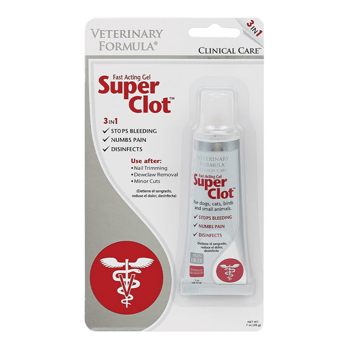 Veterinary Formula Super Clot for Pets is a safe and effective, 3-in-1 way to stop bleeding fast, numb pain and disinfect minor cuts. This fast-acting gel is great for after events like nail trimming, declaw removal and minor cuts from minor injuries.