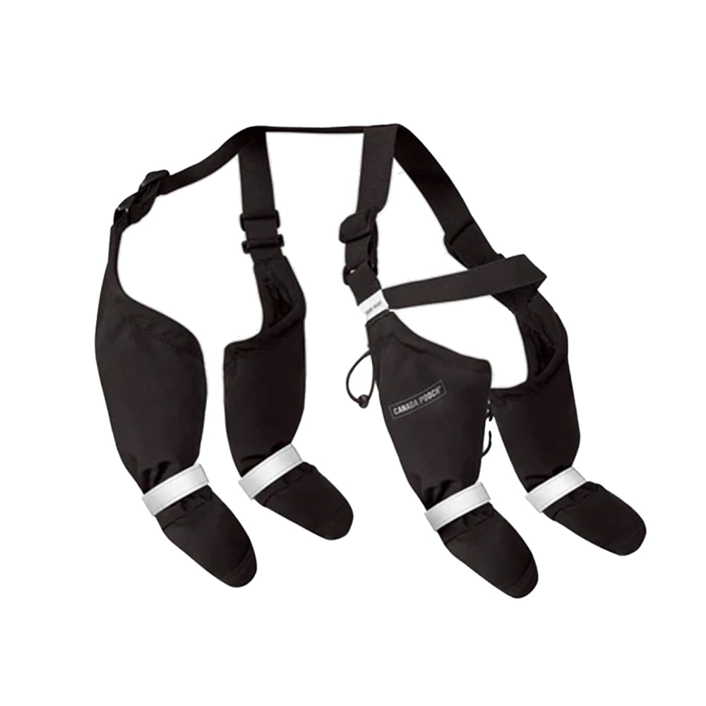 These boots provide secure paw protection and extended leg coverage. They’re adjustable and connected dog boots, which means you’ll never lose a boot. They’re also easy to layer with your favorite outerwear to stay clean and dry. (4 dog boots connected to each other)