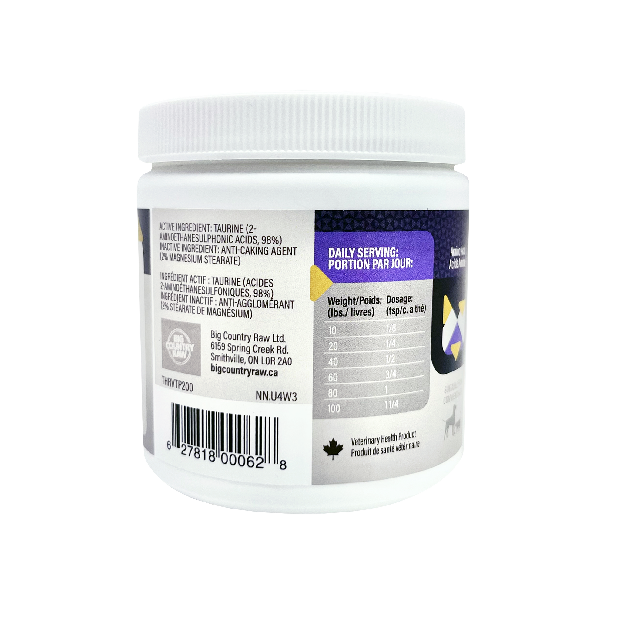 Taurine (2- aminoethanesulphonic acids, 98%), anti-caking agent ( 2% Magnesium Stearate ) – 715 mg of taurine per 1/4 tsp.
