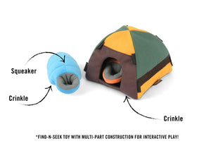 Inspired by our beloved office dog and head product tester Corbin’s love of the great outdoors, P.L.A.Y.’s Camp Corbin dog toy collection was born. This collection is comprised of all of his favorite camping essentials in plush toy form including a tent with cozy sleeping bags inside and a tasty carob s’more to enjoy by the campfire.