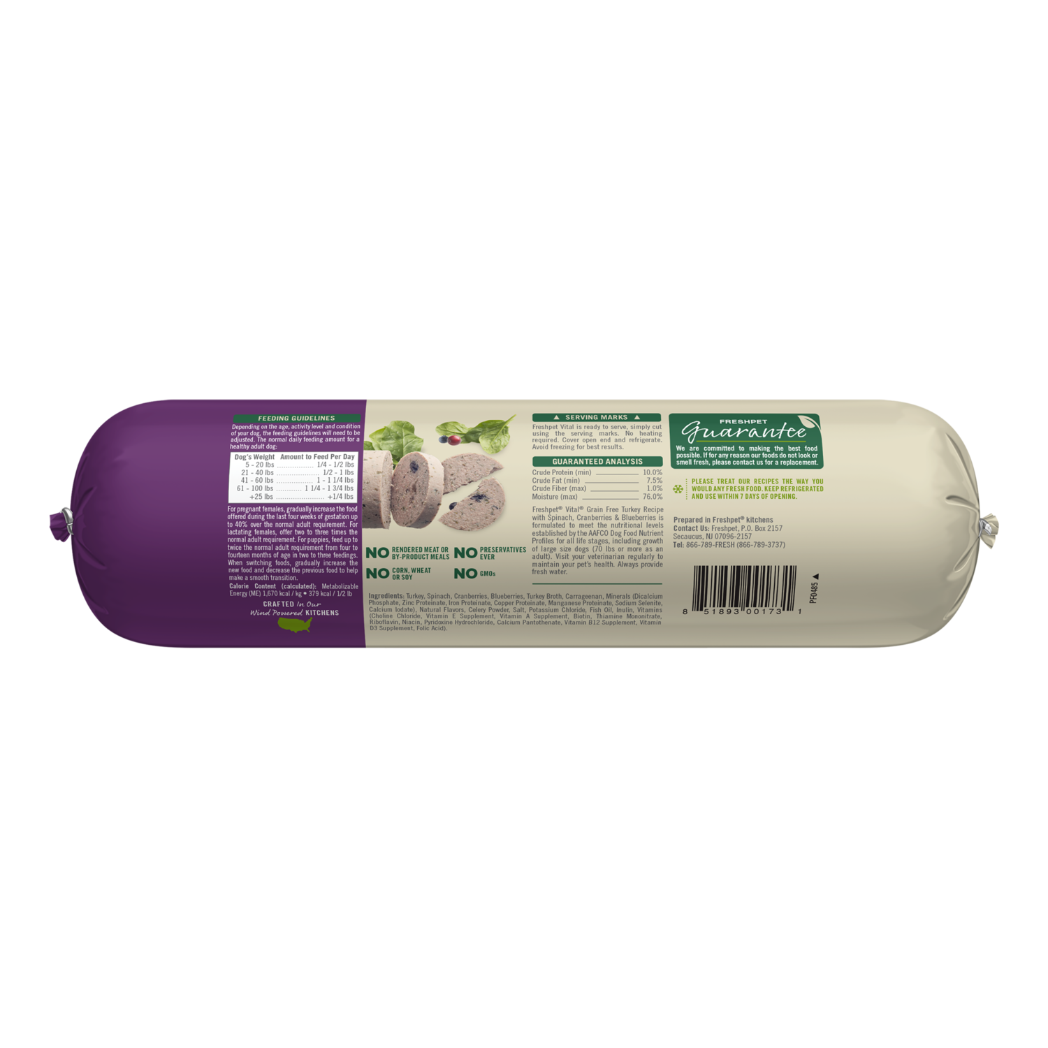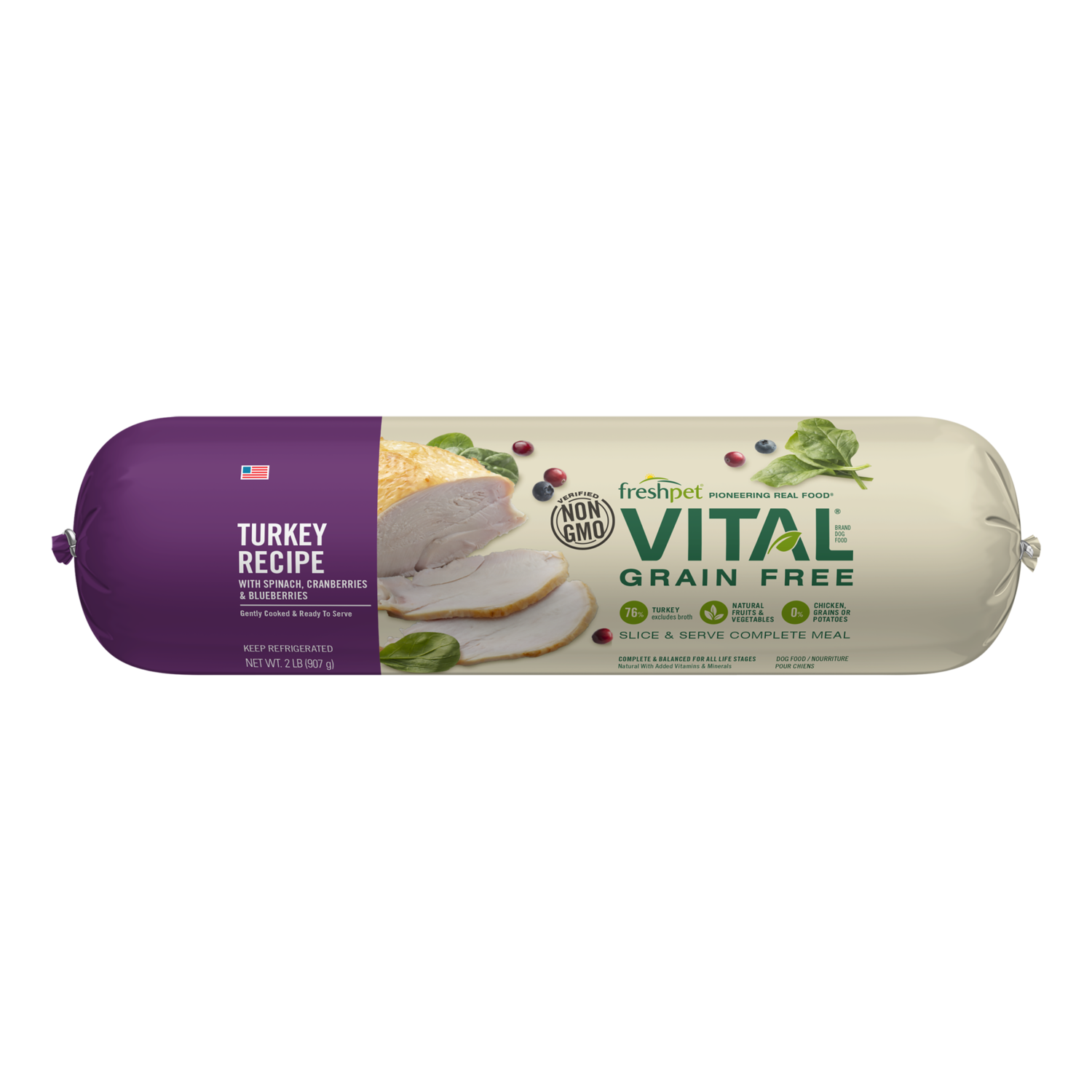 This high protein, grain free roll is made of fresh 100% natural turkey with a medley of antioxidant-rich spinach, blueberries and cranberries. Verified Non GMO.
